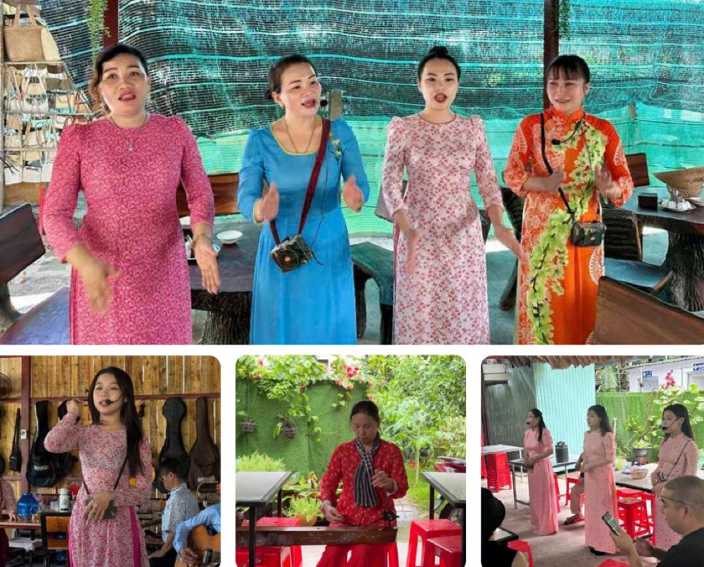 ▲ 1. 聆听湄公河三角洲传统“弹唱”表演。 2. 品尝当地果园提供的新鲜水果。