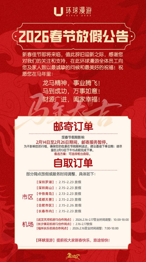 | 【2026.2.10-2.28】领取地址:(海关安检后)首都机场2号航站楼国际出发候机隔离区内“环球漫游”柜台(路过免税店直走丁字路口右侧),工作时间:7:00-19:00 【2026.3.1开始】领取地址:(海关安检前)首都机场2号航站楼1层到达公共大厅11号门内“旅游咨询柜台”办理环球漫游,工作时间:8:30-23:30【不支持领取配件及SIM卡】 (如国内转机需要送设备,请您到达T2航站楼公共大厅后,距离登机时间至少90分钟前拨打15811228081联系送机) | 2026.2.10-2.28期间7:00-19:00;2026.3.1起8:30-23:30 |