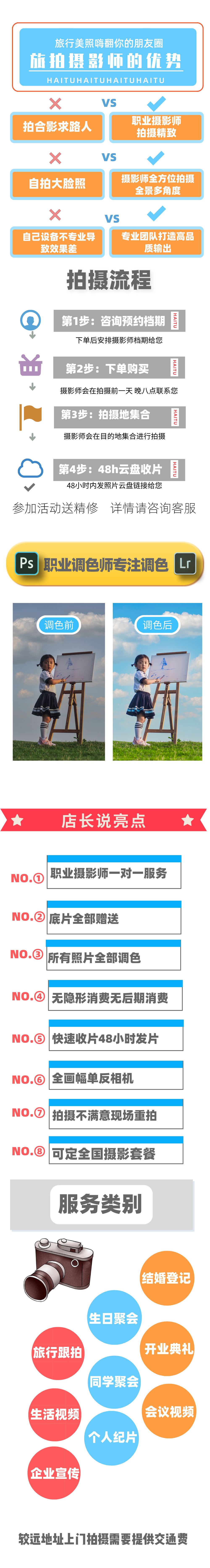 本店推出的旅行跟拍摄影服务均为摄影师一对一服务,和影楼模式完全不同。